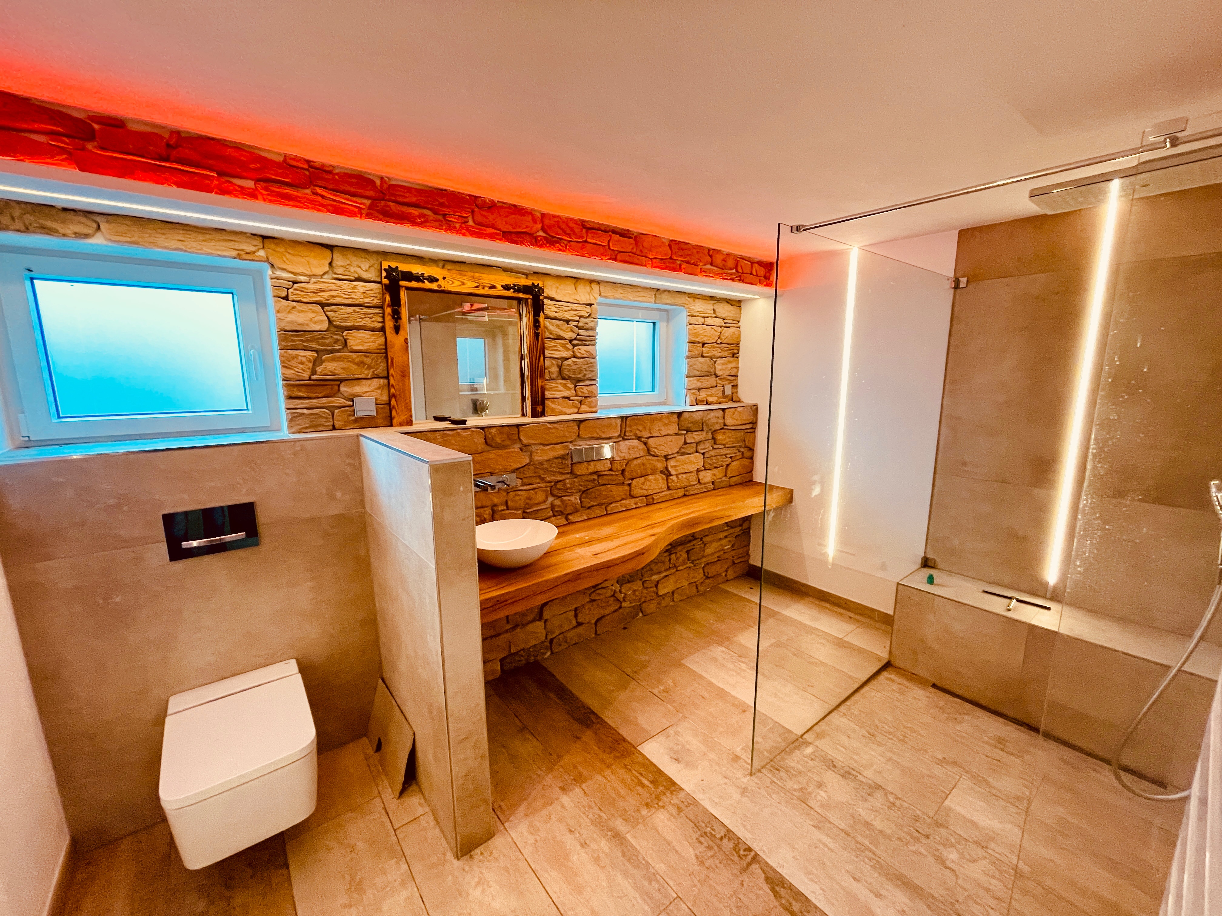 Ground floor partially converted into a granny flat, flat roof, 1 large balcony-terrace with magnificent views, 2 additional terraces, double garage, wooden windows, gas central heating, 2 bathrooms - 1 as good as new, senior-friendly shower room, 1 bathroom with bathtub, 1 fitted kitchen, solid construction, custom-built dressing room, projector with screen and surround sound system in the living room, built-in wardrobes, 2 installed air conditioning units, stair lighting, security entrance door with fingerprint reader, prime residential location with fantastic views, and much more.